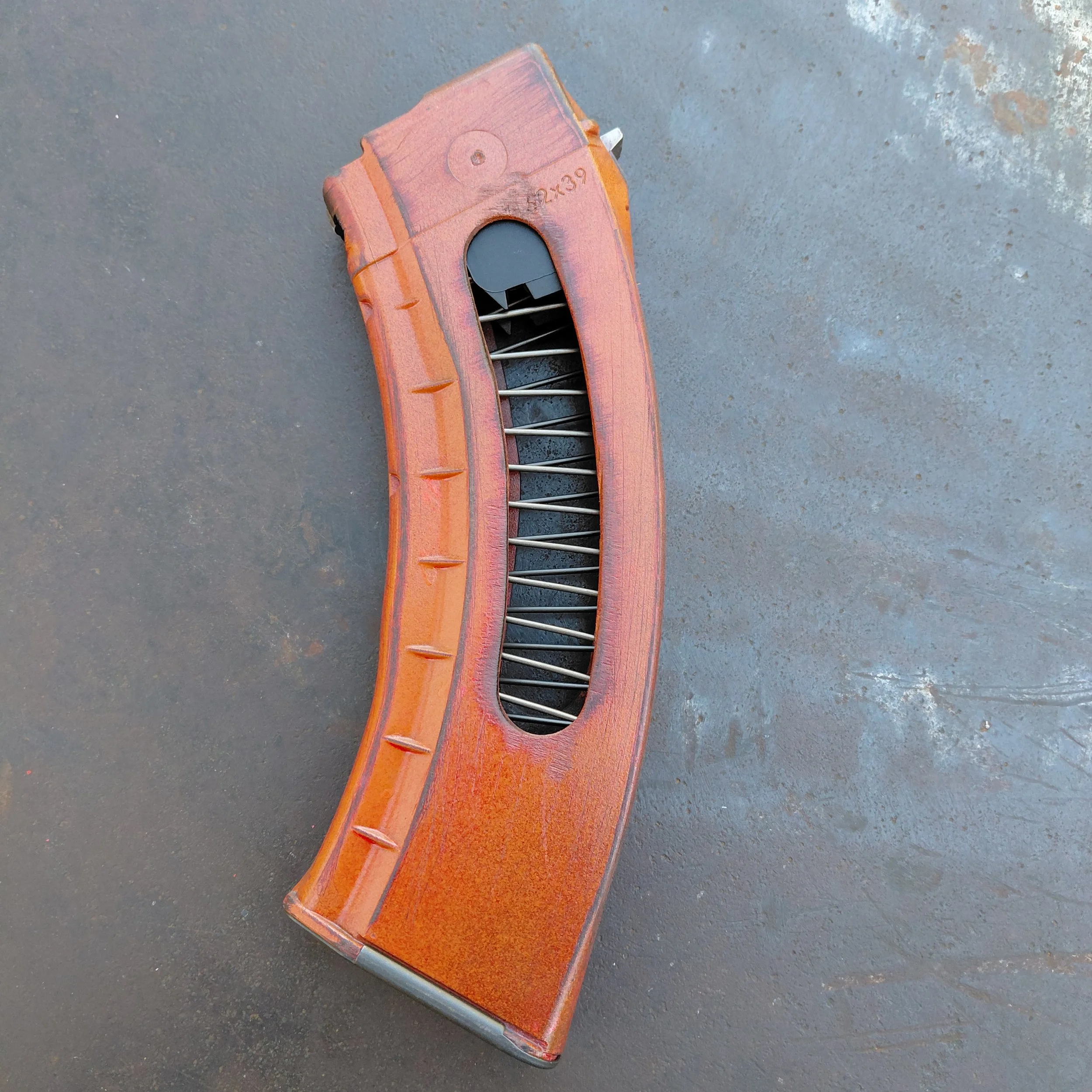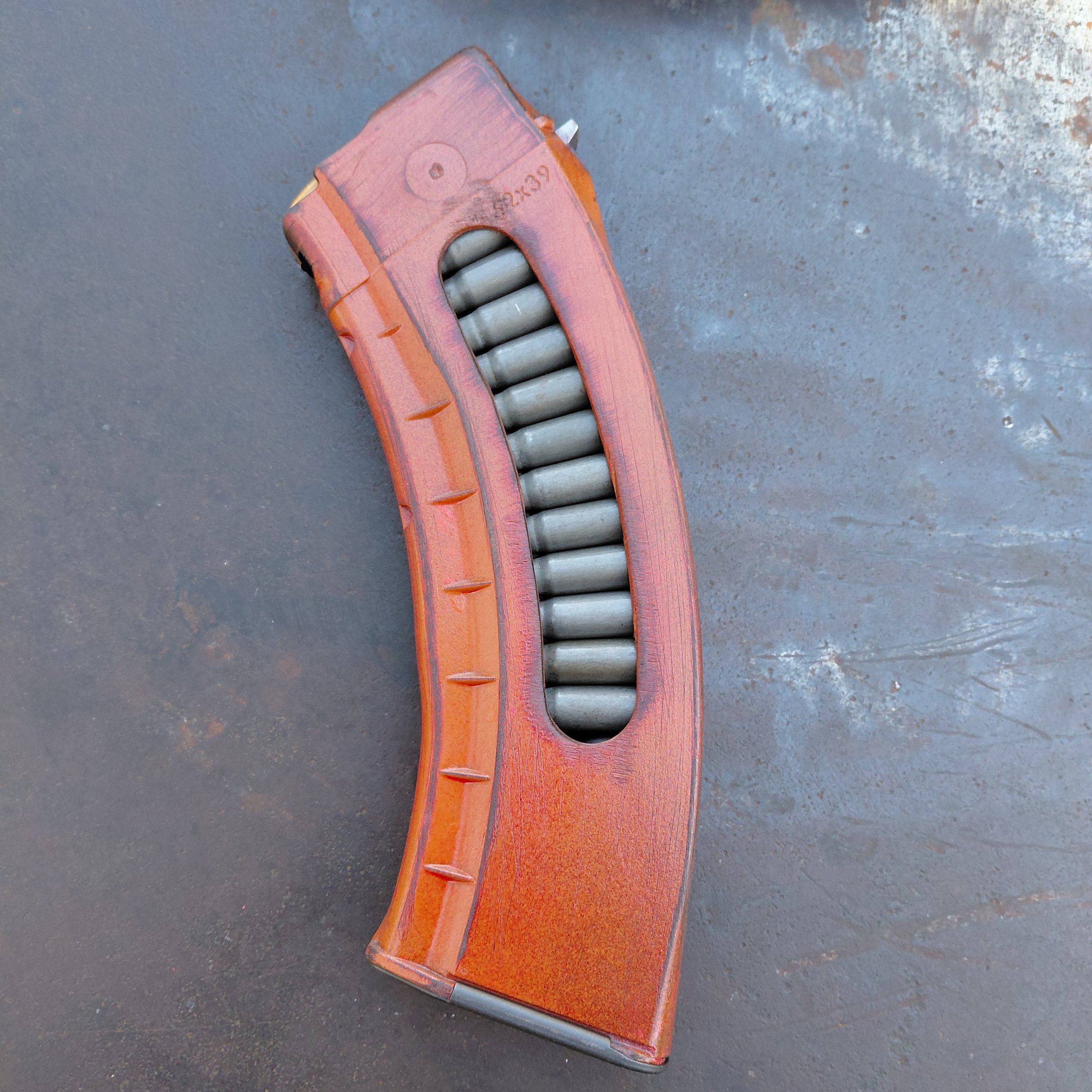 MAG INFO: Painted with some Rust-Oleum then a clear finish the paint can be scratched of if you try hard enough This mag is polymer. Has steel reinforced front and rear locking lugs. Dose not have steel feed lips. Mag will have scratches dents other minor imperfections part of the appeal.