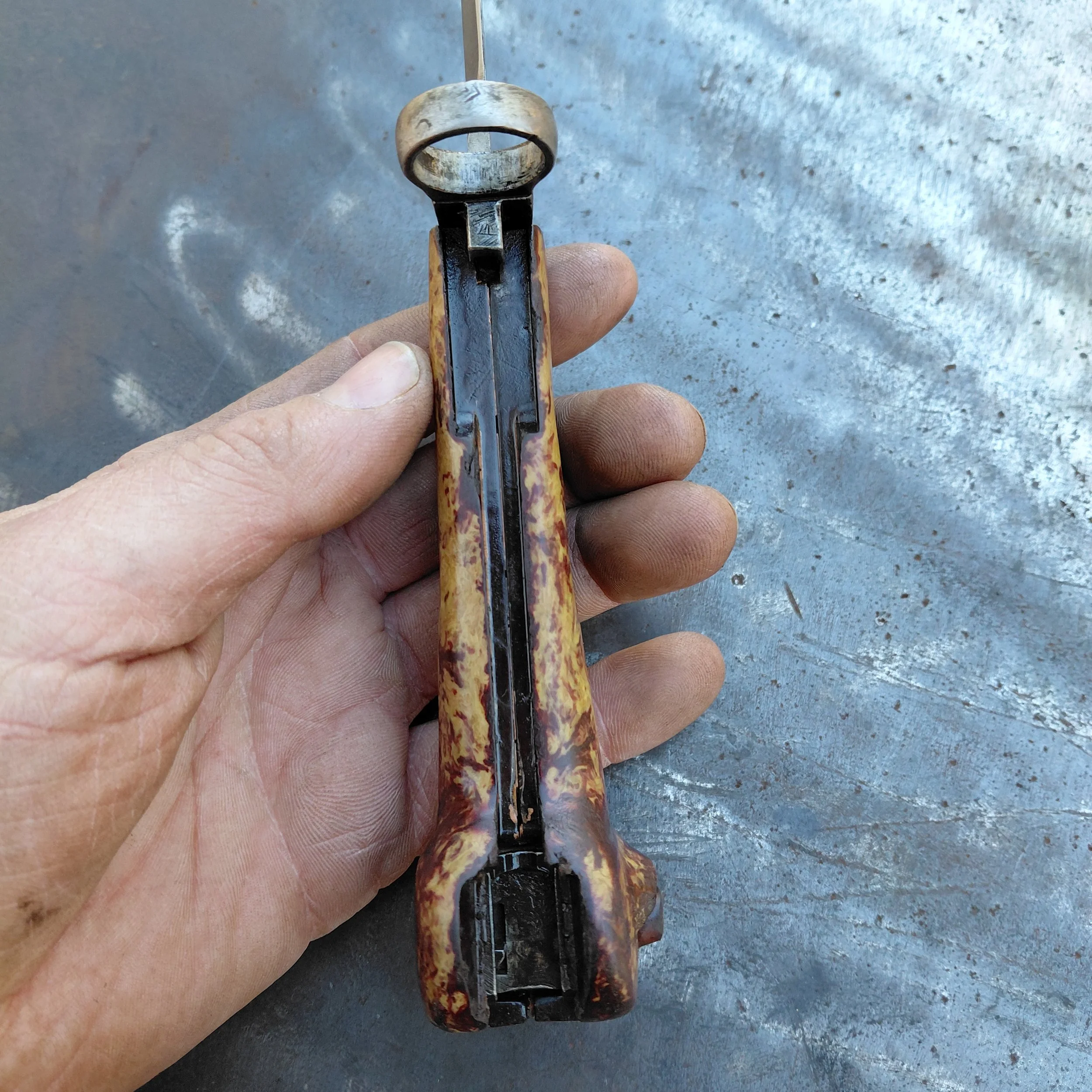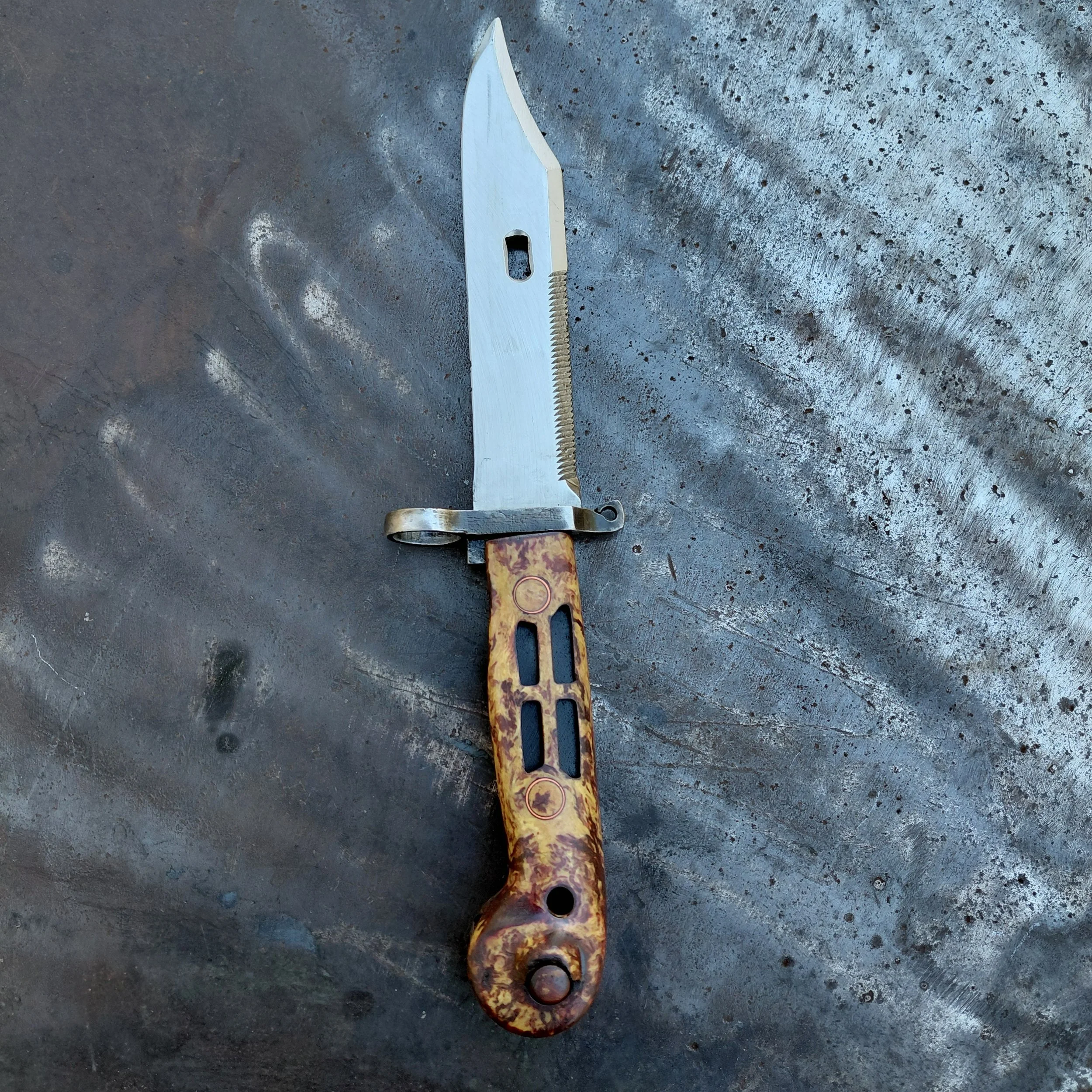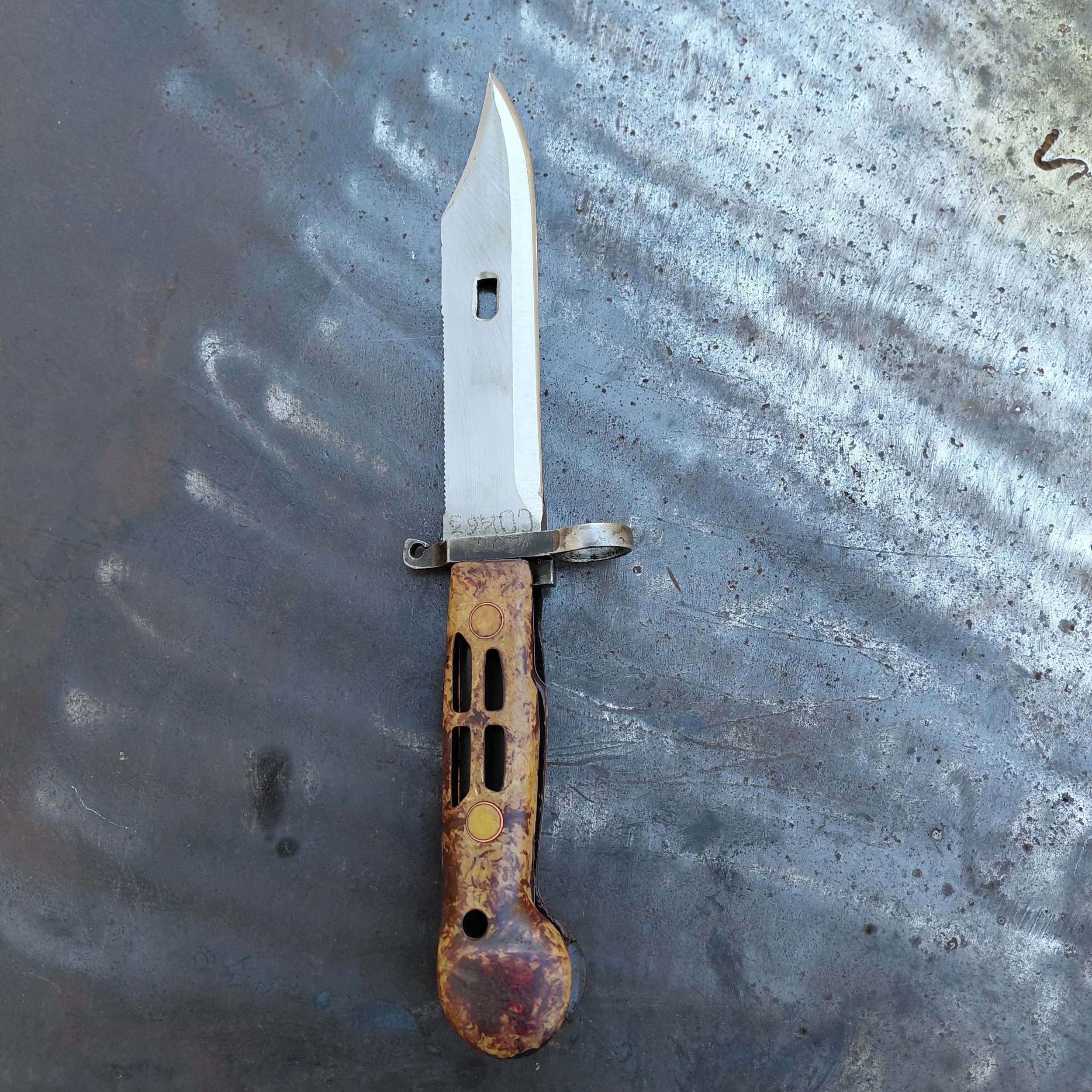 So this piece is made from a surplus military Romanian bayonet I sanded it down and finished it with clp oil (I'm not a big fan of putting polyurethane on tools) so if it ever starts to get dull in color slap some more oil on it and you should be good to go.I did not sharpen the blade I cleaned up the edge a little bit but pretty much left it stock sheath is permanently mounted its welded to a steel plate. That way you can still remove the blade