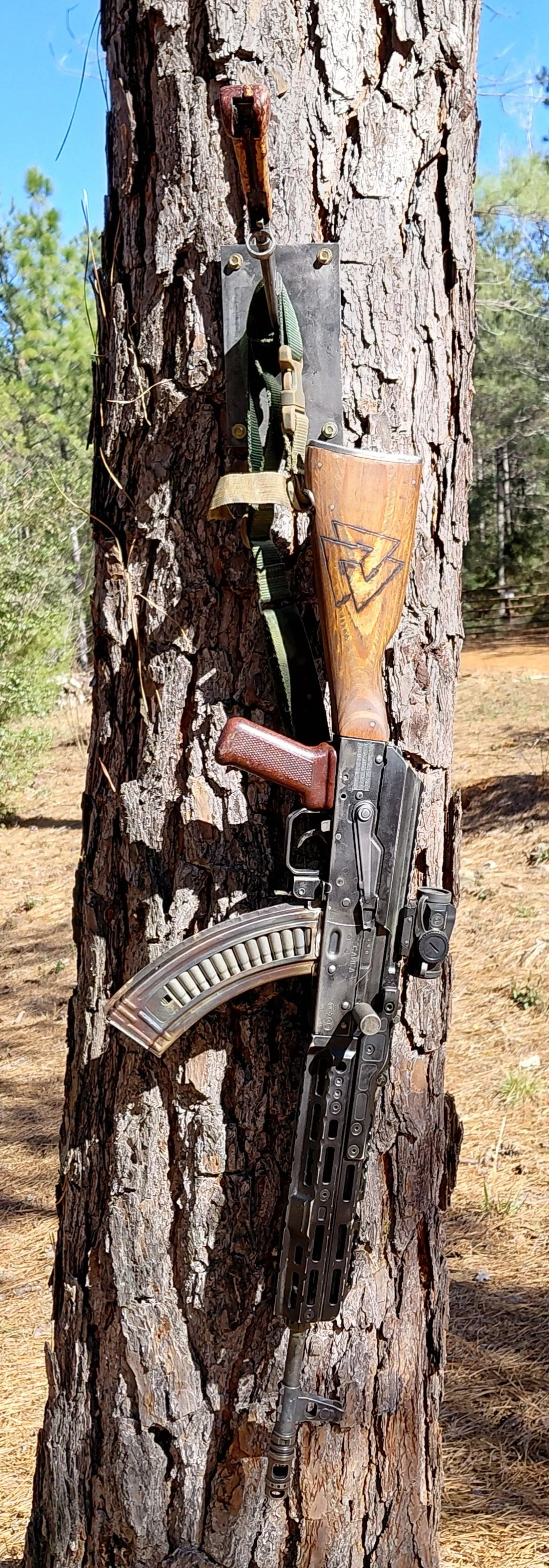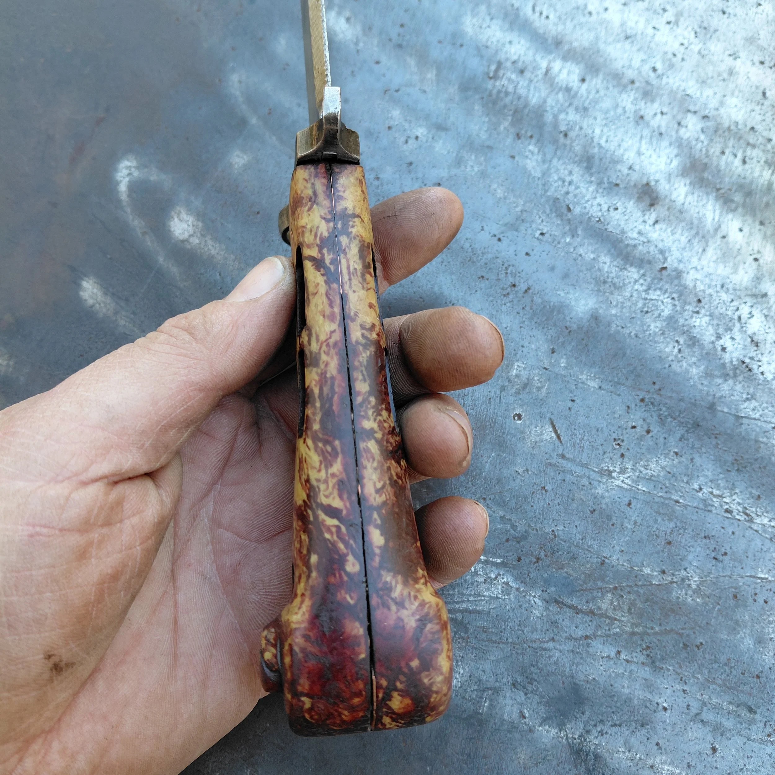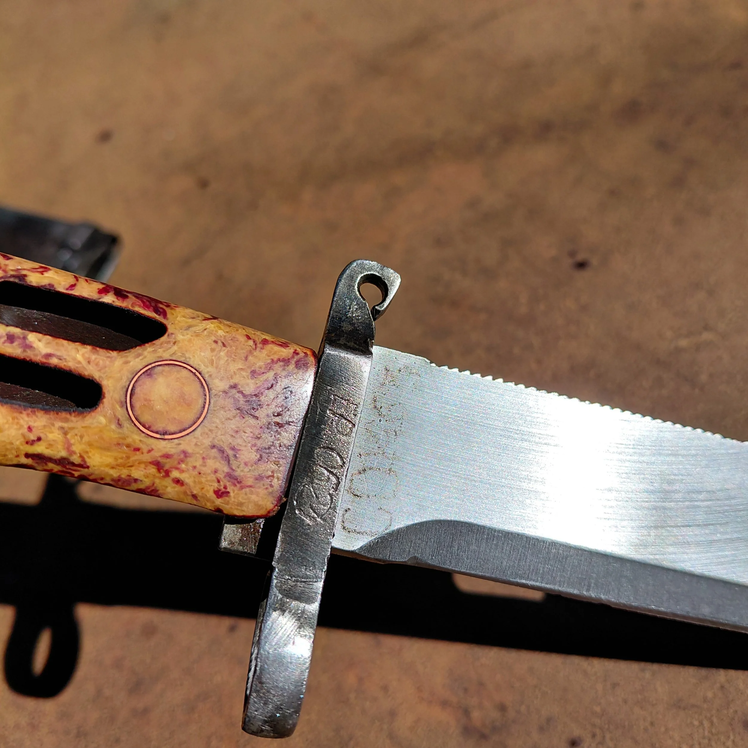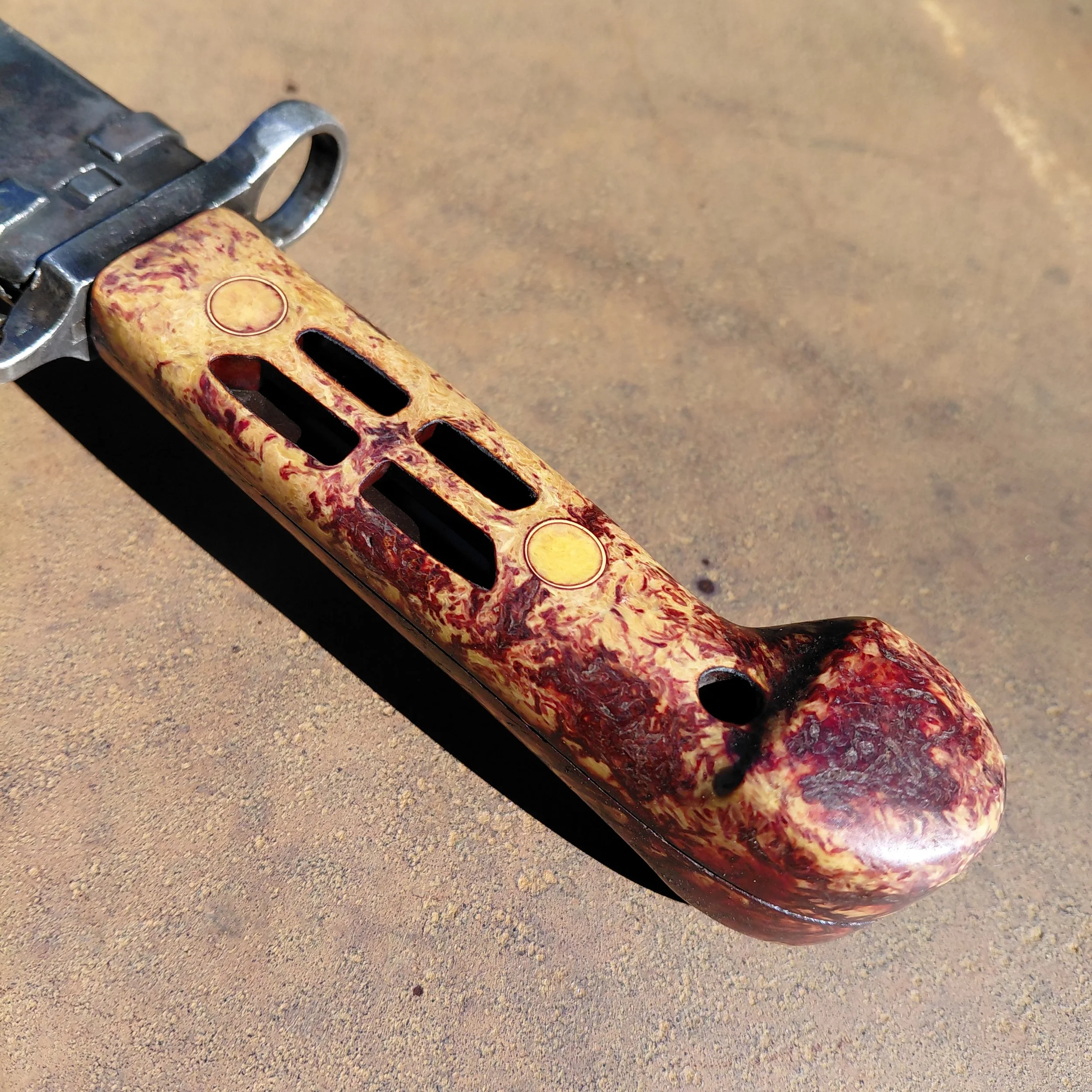So this piece is made from a surplus military Romanian bayonet I sanded it down and finished it with clp oil (I'm not a big fan of putting polyurethane on tools) so if it ever starts to get dull in color slap some more oil on it and you should be good to go.I did not sharpen the blade I cleaned up the edge a little bit but pretty much left it stock sheath is permanently mounted its welded to a steel plate. That way you can still remove the blade